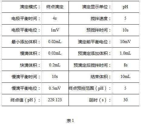 用量筒移取50mL樣品,并稱重。選擇“終點滴定”模式,以pH=3作為終點。插入電極,待電位穩定后用鹽酸溶液滴定至終點。