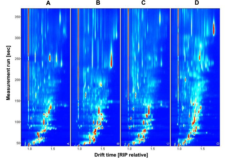 通過GC-IMS在6分鐘內獲得的色譜圖(圖3)顯示了在所有顆粒化聚合物(A-D)中存在大量的VOCs(與藍色背景不同的斑點)。濃度越大,峰強度越高(紅色表示)。這表明這些材料是汽車艙內空氣中VOCs的主要來源。此外,通過所選擇的氣味化合物的信號,鑒定了與氣味相關的一些揮發性化合物,并比較了峰的強度(圖4)。從圖4中可以看出,樣品D具有更高濃度的氣味化合物。因此,我們可以通過GC-IMS快速分析、測定車輛內飾使用的聚合材料所發出的氣味相關的VOCs,從而確定車內氣味來源。