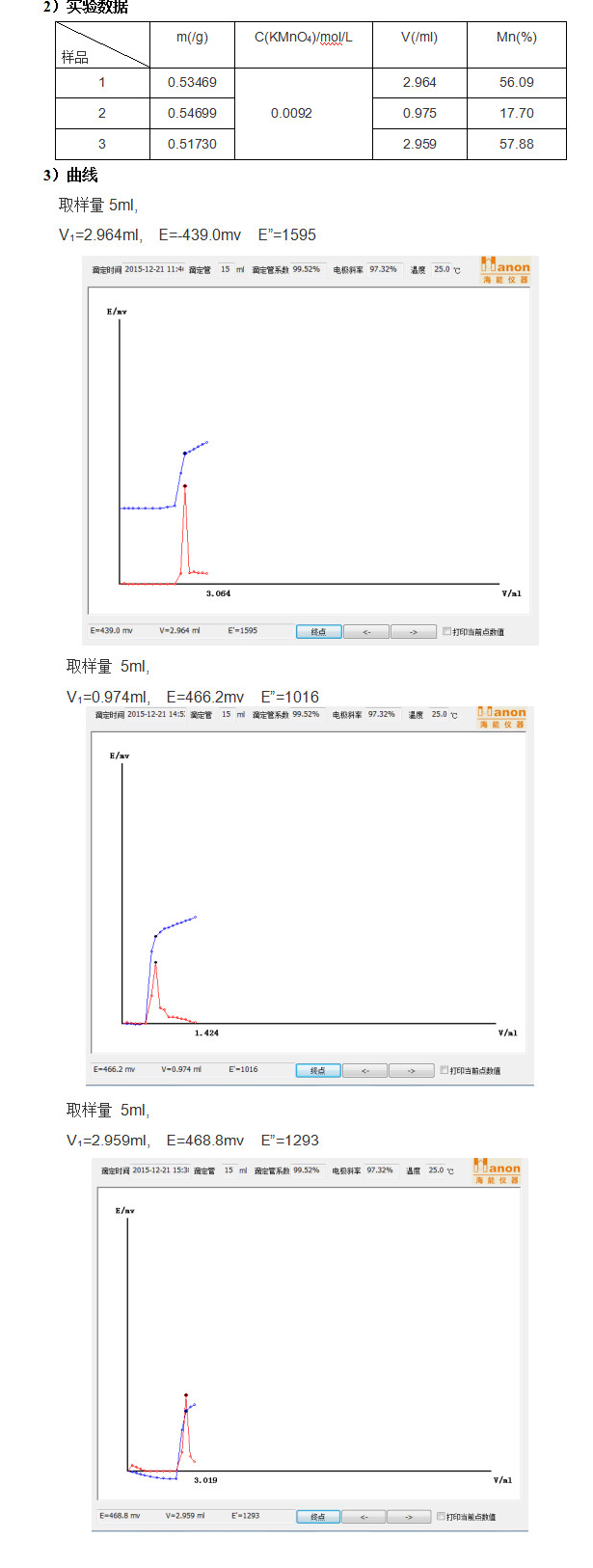 用移液槍移取試液5ml,加入10ml飽和焦磷酸鈉,80ml稀釋水于滴定杯中,以鉑電極作指示電極,飽和甘汞電極作參比電極,高錳酸鉀進行滴定。