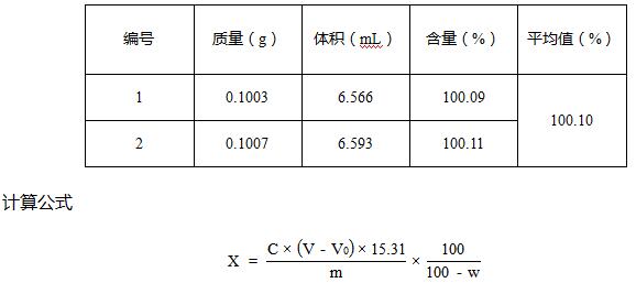 氟康唑原料藥含量大于99.0%即為合格,本次實驗樣品氟康唑原料藥中含量為100.10%,符合要求。另外,實驗結果表明,本次實驗重復性良好,可以滿足檢測需求。
