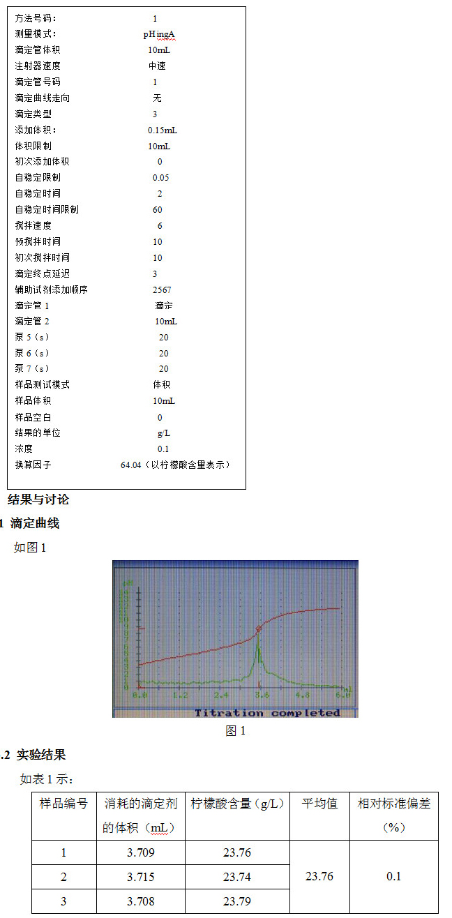 對于果汁的酸度是指滴定酸度的總和,通過加入一個標準濃度的NaOH溶液,溶液到達一個適當的pH后,電位突躍,儀器指示到達終點,停止滴定。結果通常表示為g / l的檸檬酸含量。