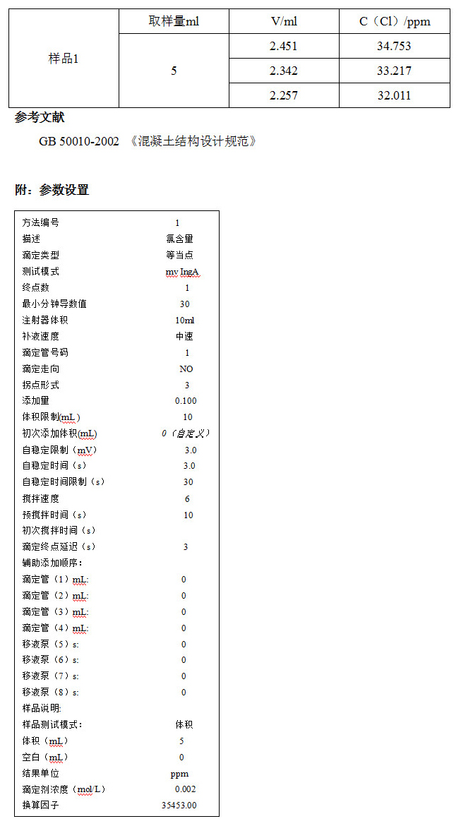 混凝土中氯離子對混凝土中鋼筋的銹蝕,是其主要的危害,國家標準GB 50010-2002 《混凝土結構設計規范》中就規定了最大氯含量,因此檢測其中的氯含量有很重要的意義。實驗采用電位滴定的方法檢測混凝土中的微量氯離子,得到較滿意的效果。