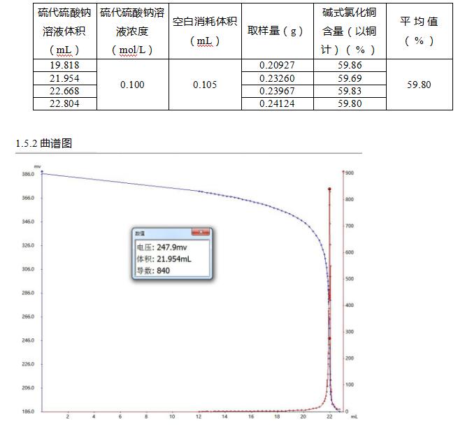 碘化鉀與二價銅反應,析出等摩爾碘。用硫代硫酸鈉標準溶液滴定析出的碘,即可測定堿式氯化銅的含量。