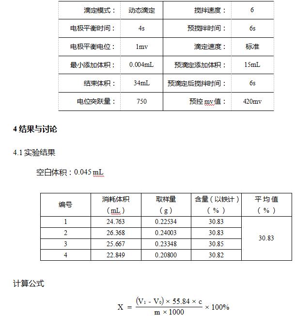 稱取約0.2g(準確到0.0002g),置于滴定杯中,加入30mL水。再加入10mL硫磷混酸溶液。立即用重鉻酸鉀溶液進行滴定到終點,記錄用量,同時做空白實驗。