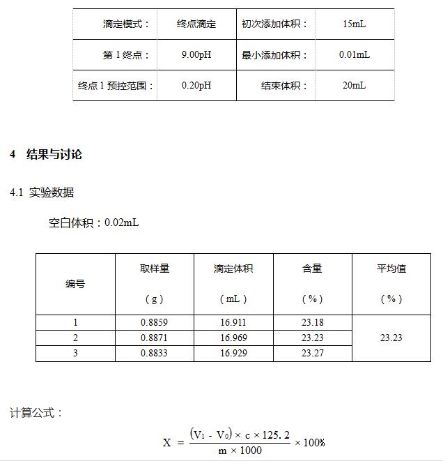 準確稱取牛磺酸顆粒,加水90mL,振搖使主要成分溶解,用NaOH滴定液調節pH至7.0,加入預先調節pH的甲醛溶液15mL,搖勻,以pH復合電極作為滴定電極,選用終點設置滴定,用NaOH溶液滴定至pH至9.0并持續30s,以加入甲醛溶液后消耗的NaOH溶液的量計算。