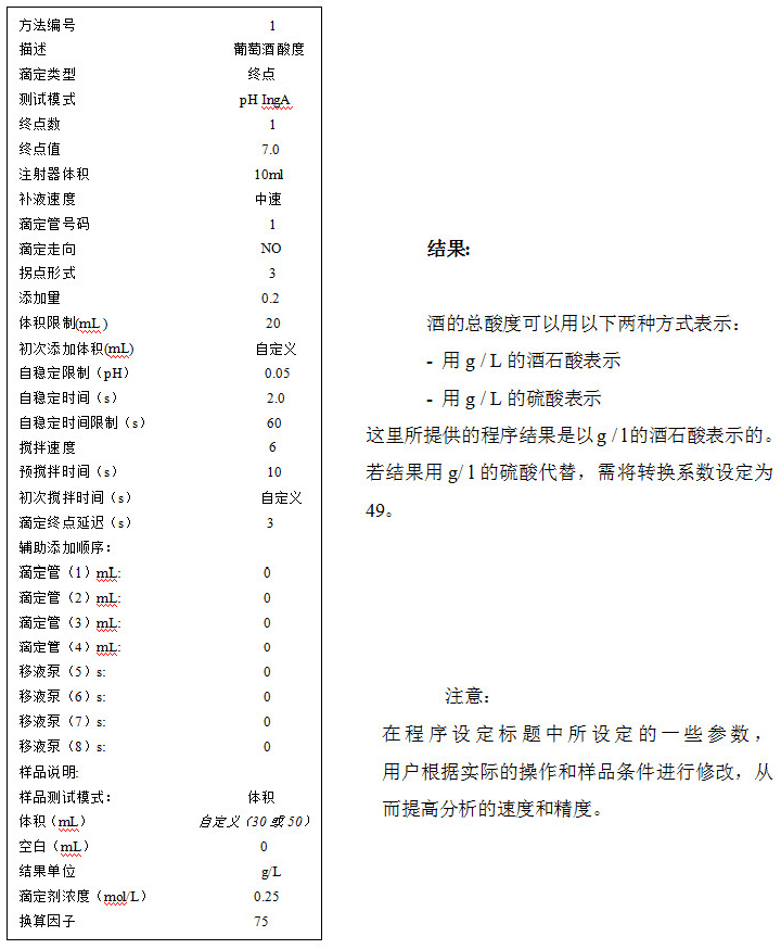 酒的總酸度是可滴定酸度的總和,使用標準濃度的NaOH溶液滴定pH至7.0,結果用 g / l的酒石酸(或硫酸)表示。由于CO2會影響實驗的測定,樣本測試前必須先前在超聲浴中或攪拌下真空脫氣。