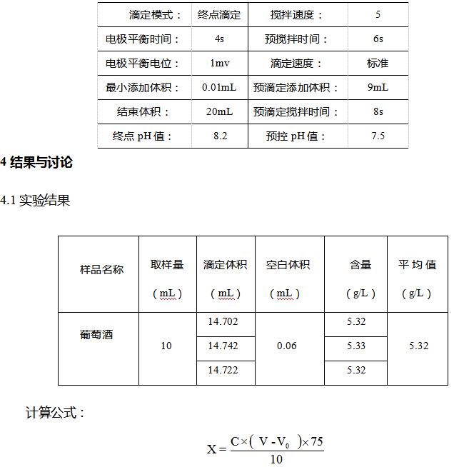 用移液管準確吸取10mL葡萄酒樣品(液溫20℃),置于滴定杯中,加入50mL水,插入電極用氫氧化鈉滴定液滴定至pH=8.2為終點。空白實驗取50mL水加入滴定杯中,用氫氧化鈉滴定液滴定至終點。