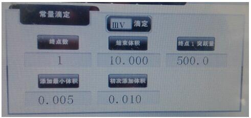 在滴定杯中稱取約10g潤滑油樣品,加入70ml的混合溶劑,將滴定杯放在攪拌臺上,在儀器的初始界面中點擊“攪拌”,攪拌約15min后,調整好電極的高度,進行滴定,儀器中選擇“滴定”—“常量滴定”,參數設定如下: