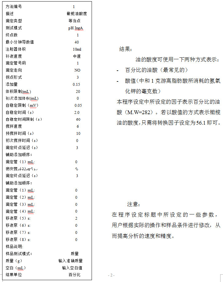 - 在手動方法中,使用KOH的乙醇溶液滴定溶劑混合物中添加直至指示劑即酚酞顏色發生變化,這是非常重要的。同樣的使用滴定儀時如果不以這種方式進行滴定操作,是不準確的。