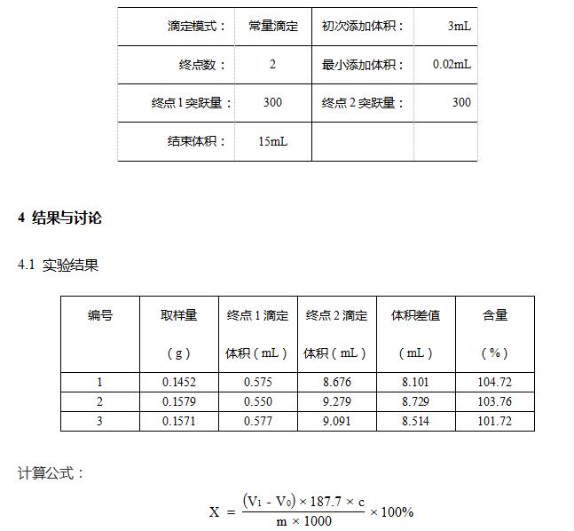 取本品約0.15g,精密稱定,置電位滴定儀專用燒杯中,加0.01mol/L鹽酸溶液5mL與乙醇50mL使溶解,用標定的氫氧化鈉滴定液(0.1000mol/L)滴定,兩個突躍點體積的差作為滴定體積。