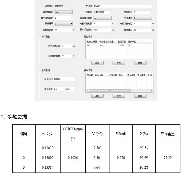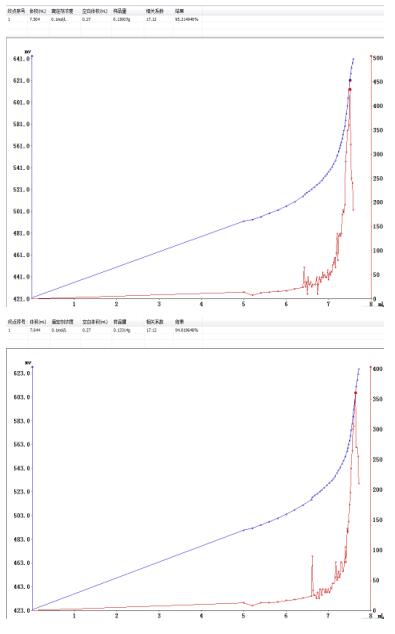 樣品中甲硝唑含量為97.50%(此結果按濕品計算)。樣品中的水分會對重復性有影響,建議用干品進行試驗。從圖譜中可看出,突躍大滴定終點一目了然。配合滴定儀自動進樣器進行滴定,操作方便節省了時間和人力,能快速的檢測出結果。