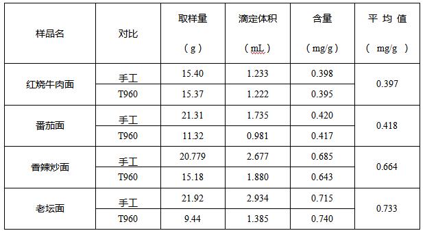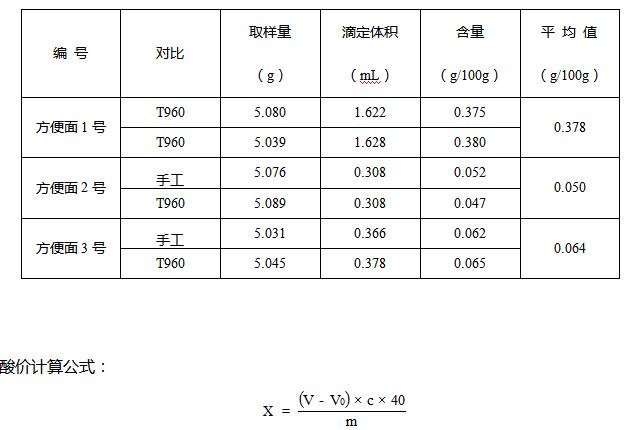 由酸價圖譜可知,不同的方便面油脂圖形走勢不同,所以需要根據國標中提供的參考圖仔細分辨,實驗結果平行良好,可以使用自動進樣器進行滴定。另外,酸價圖譜前端均出現高突躍量的雜峰,所以應設置相應的預控pH值,以免影響最終結果的判定。