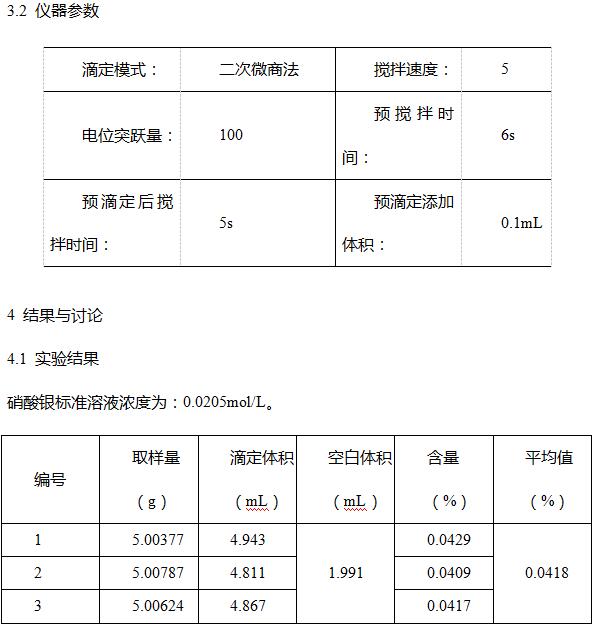 稱取約5g試樣,精確至0.0001g,置于滴定杯中,加入20mL水和攪拌子,磁力攪拌使試樣完全分散,然后在攪拌下加入25mL硝酸(1+1),加入55mL水。加入2.00mL氯離子標準溶液(0.02mol/L)和2mL過氧化氫(30%),加熱煮沸,微沸1min~2min。冷卻至室溫,在溶液中插入氯離子電極和雙鹽橋甘汞電極,開始攪拌。用硝酸銀標準滴定溶液逐漸滴定,滴定至mV值讀數變化不大時為止。用二次微商法計算出消耗的硝酸銀標準滴定溶液的體積。二次微商法的計算參見附錄。