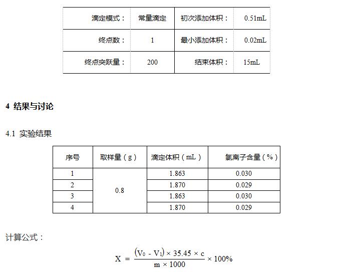 樣品中氯離子含量很低,直接滴定不易滴定,測試平行性較好。