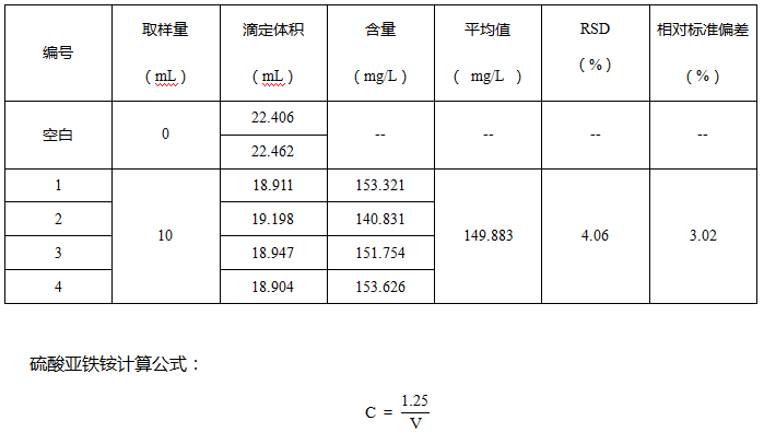 V --滴定時消耗硫酸亞鐵銨溶液的體積,單位為毫升(mL)。