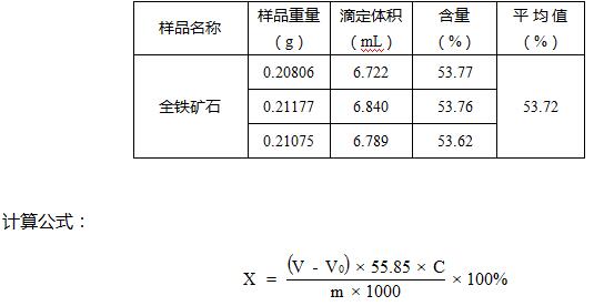 本文采用電位滴定的方式測定全鐵礦石中鐵的含量,實驗數據表明儀器測定結果重復性良好,能夠滿足分析工作的需要。
