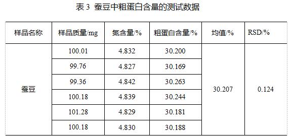 另外使用D100杜馬斯定氮儀測試蠶豆中的粗蛋白含量,重復性符合兩個獨立測量結果之間的絕對差值不超過算術平均值的10%的要求,且RSD均小于0.5%,重復性良好。