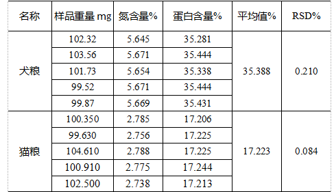 數據重復性符合《GB/T 24318-2009 杜馬斯燃燒法測定飼料原料中總氮含量及粗蛋白質的計算》標準要求的RSD小于0.638。