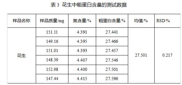 另外使用D100杜馬斯定氮儀測試花生中的粗蛋白含量,重復性符合兩個獨立測量結果之間的絕對差值不超過算術平均值的10%的要求,且RSD均小于0.5%,重復性良好。