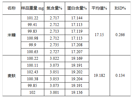兩種測試結果平行性符合《GB/T 24318-2009 杜馬斯燃燒法測定飼料原料中總氮含量及粗蛋白質的計算》標準要求的粉狀飼料的RSD小于0.444。