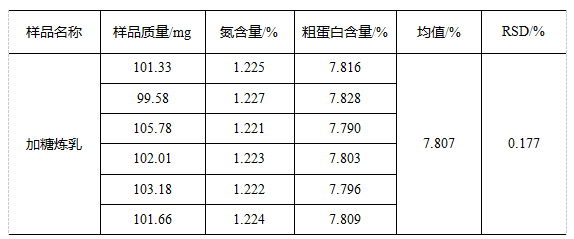 另外使用D100杜馬斯定氮儀測試煉乳中的粗蛋白含量精密度符合《GB 5009.5-2016 食品安全國家標準 食品中蛋白質的測定》中規定的兩次獨立測定結果的絕對差值不超過算術平均值的10%的要求,且RSD值為0.177%,重復性良好。