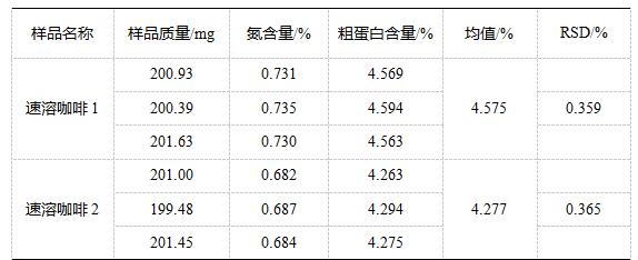 另外使用D100杜馬斯定氮儀測試速溶咖啡中的粗蛋白含量精密度符合《GB 5009.5-2016 食品安全國家標準 食品中蛋白質的測定》中規定的兩次獨立測定結果的絕對差值不超過算術平均值的10%的要求,且RSD值為0.359%和0.365%,重復性良好。