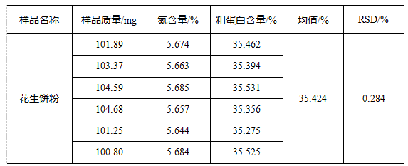 通過實驗結果可以看到,本次測試的花生餅粉粗蛋白含量為35.424%,低于市場上花生餅粉44%的蛋白質含量。 另外使用D100杜馬斯定氮儀測試油枯餅中的粗蛋白含量,RSD值為0.284%,重復性良好。