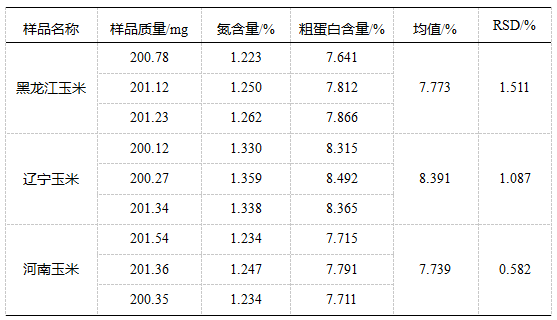中國是世界第二大玉米生產國和第一大玉米消費大國,播種面積僅次于稻、麥,在糧食作物中居第三位,玉米作為一種長壽食品,富含豐富的營養成分,其中蛋白質含量是僅次于糖類的營養成分。本實驗選取了黑龍江、遼寧和河南的大米,對玉米中的蛋白質使用杜馬斯分析儀進行定量測定。