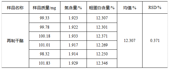 另外使用D100杜馬斯定氮儀測試再制干酪中的粗蛋白含量結果準確,精密度符合《GB 5009.5-2016 食品安全國家標準 食品中蛋白質的測定》中規定的兩次獨立測定結果的絕對差值不超過算術平均值的10%的要求,且RSD值為0.371%,重復性良好。