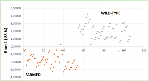 第二種分析方法,采用監督的方式對所有的數據進行分析。在這個分析方法里,使用Statistica v. 7軟件選取較準后的5個特征標記物進行LDA分析。如圖2所示,可以得出一種判別式分析方法(Root 1)。由圖所所示,養殖三文魚和野生三文魚能夠明顯的區分開,且Root 1的數值達到88%。