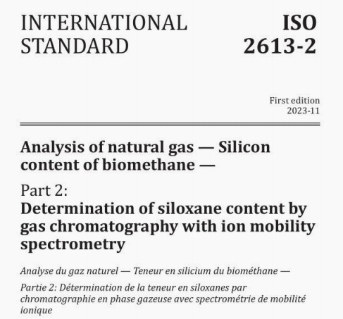 ISO標準《天然氣分析 生物甲烷的硅含量 第 2 部分:通過氣相色譜離子遷移譜法測定硅氧烷含量 》描述了一種適用于實驗室和在線分析的生物甲烷中硅氧烷含量的測定方法。