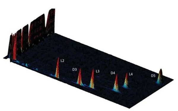 3.硅氧烷和其他氣體成分從氣相色譜柱中洗脫,并被引入IMS漂移管。低輻射氚源產生反應物離子H+(H2O)n。這些反應物離子與反應物離子發生質子轉移產生特定的分析物離子。它們以規定的頻率(通常每30毫秒)釋放到漂移管中,在外加電場下通過遷移管。同時,氮氣以相反的方向逆向通過漂移管。當待測離子與氮氣流動逆向作用時,它們會因質量和幾何形狀不同到達檢測器的時間不同,產生與撞擊檢測器的離子數量成正比的電勢變化(分析儀響應)。氣相色譜與離子遷移譜二次分離得到一個三維色譜圖,如下面的例子所示(參見圖1)。