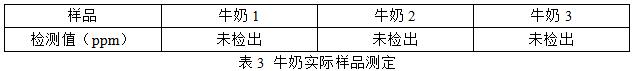 3.3 樣品檢測結果對從市場購買的四個不同品牌的牛奶用建立好的高效液相色譜法進行檢測,測得的結果如表3所示。結果表明,3個不同品牌牛奶中所含的三聚氰胺含量均符合國家限量標準。