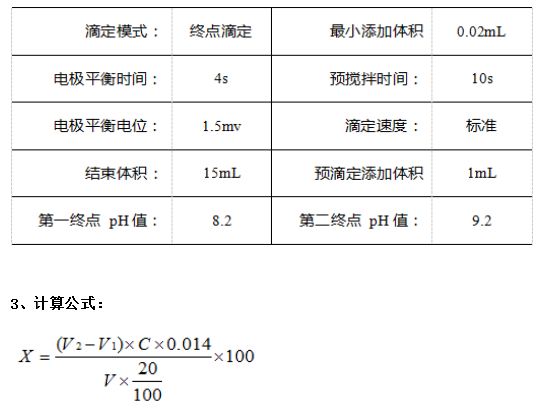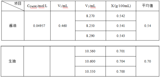 準確吸取待測樣品5.0mL置于100mL容量瓶中,加水至刻度。混勻后吸取20.0mL,置于滴定杯中,加水60mL,插入復合電極,開動攪拌器,用氫氧化鈉標準溶液滴定至pH=8.2,記錄氫氧化鈉標準溶液的體積(按總酸計算公式,可計算出醬油的總酸含量)。