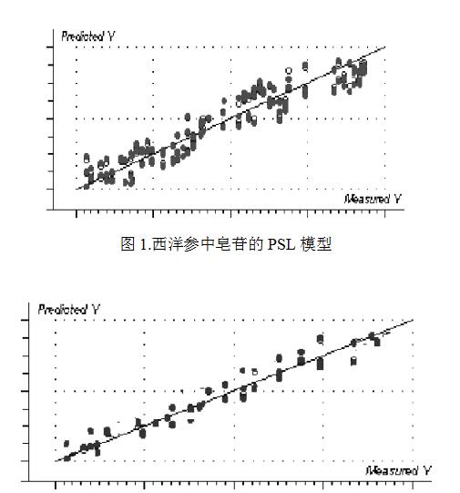 使用近紅外光譜儀掃描軟件對各樣品進行光譜采集。采用置頂旋轉杯測樣方式。得到的樣品光譜和一級數據通過建模軟件一一對應后,通過PLS1方法進行計算,分別得出人參和西洋參中皂苷的PLS模型。