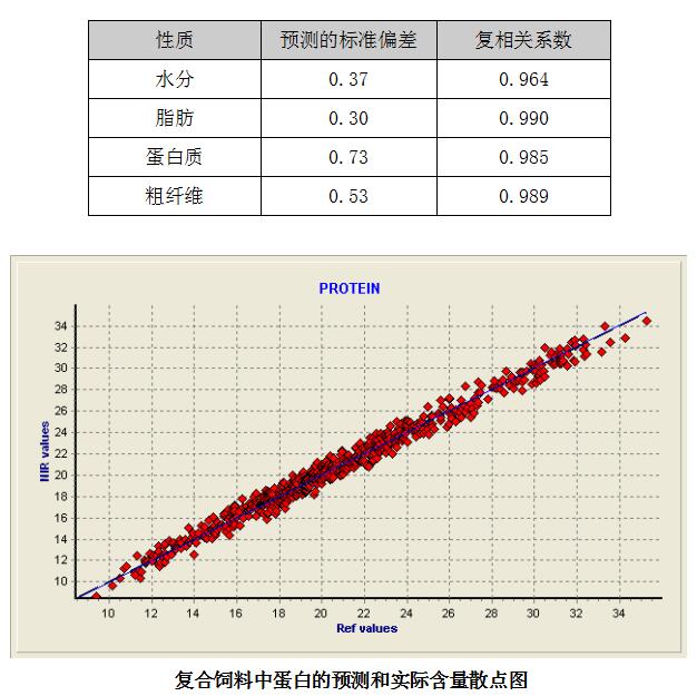 建立復合飼料水分、蛋白質、脂肪和粗纖維的偏最小二乘(PLS)模型。相關系數表示的是濕化學測試和近紅外測試結果的一致性。系數接近1幾乎完全相關,這與實驗室的精密程度和成分范圍有關。預測的標準偏差反映了此定標模型對不參與制作建模的樣品集的預測性能。下表顯示的是模型外部預測的相關系數和標準偏差。