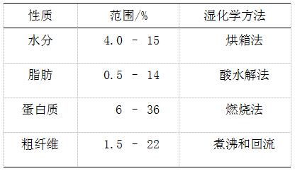 用約300份復合飼料建立了水分、蛋白質、脂肪和粗纖維標準。下表顯示的是校正集樣品的水分、蛋白質、脂肪和粗纖維范圍,以及分析用的濕化學方法。