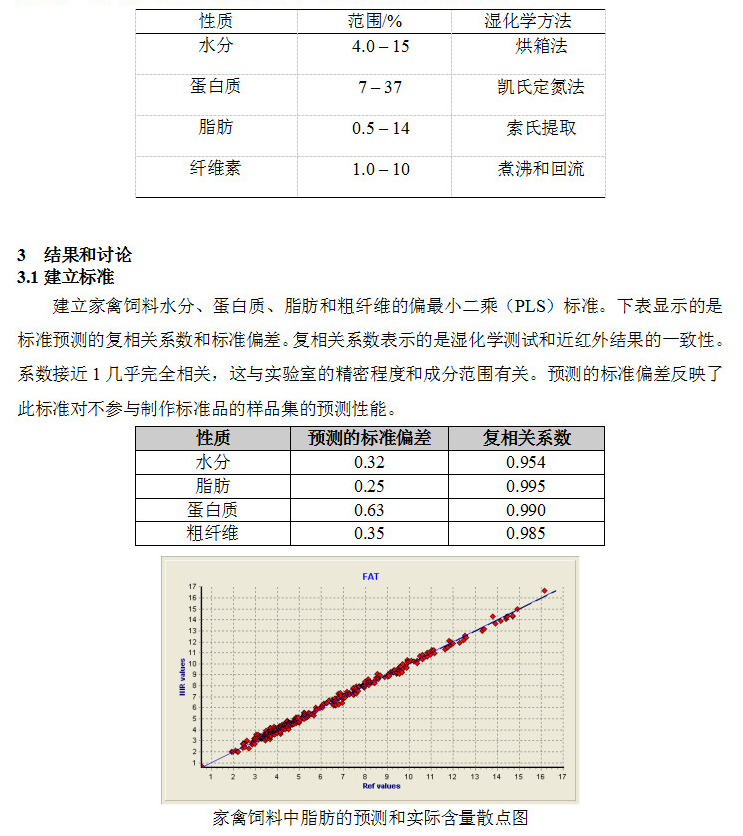 使用約300份家禽飼料建立了水分、蛋白質、脂肪和粗纖維標準。下表顯示的是標準品的水分、蛋白質、脂肪和粗纖維范圍,以及分析用的濕化學方法。