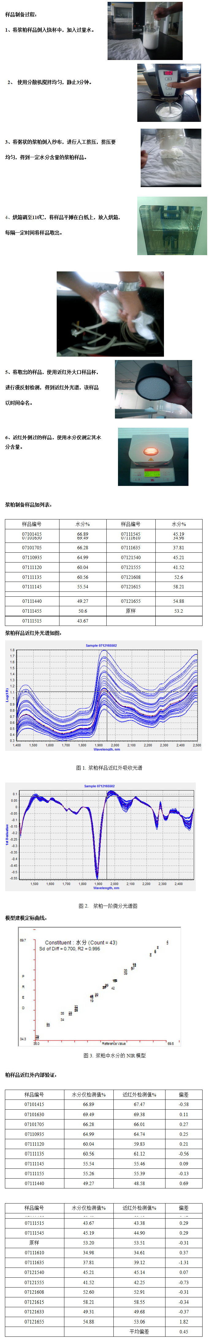 上述可見,通過此方法制備漿粕樣品,使其水分含量形成一定范圍的梯度,并通過化學偏最小二乘法進行建模是完全可行的。模型中漿粕水分含量與近紅外光譜有很好的線性關系,達到0.995。