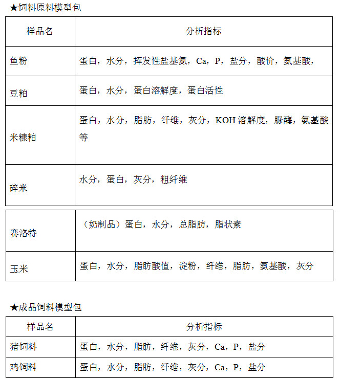 1. 根據檢測需求,為您制定兩個檢測模型包,包含飼料原料模型包和成品飼料模型包,初步建立統計模型如下列表。