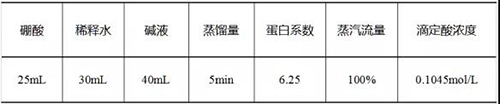 硫酸(分析純),20g/L硼酸溶液,溴甲酚綠-甲基紅混合指示劑,40%氫氧化鈉溶液,混合催化劑(3gK2SO4、0.2gCuSO4),0.1045mol/L硫酸標準滴定液。