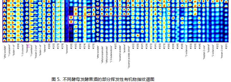 2)區域C標出的物質如ethyl acetate(乙酸乙酯)、ethyl propanoate(乙酸丙酯)、2,3-butanedione(2,3-丁二酮)、isoamyl acetate(乙酸異戊酯)、acetone(丙酮)等物質在2號酵母發酵的果酒中含量最高;