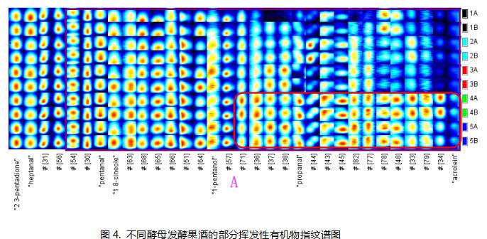 1) 區域A標出的揮發性有機物如acrolein(丙烯醛)、propanal(丙醛)、1-pentanol(丙醇)、1,8-cineole(1,8-桉樹腦)、pentanal(戊醛)等物質隨著5種酵母的不同,發酵后果酒中這類揮發性有機物的含量逐漸增加,其中紅框圈出的物質在1號、2號和3號酵母中的含量較低,而在4號和5號酵母發酵的果酒中含量最高。
