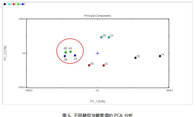 3) 由上圖分析可知,4號和5號酵母發酵的果酒風味最為相似,與前三種酵母發酵的果酒風味差異較大。