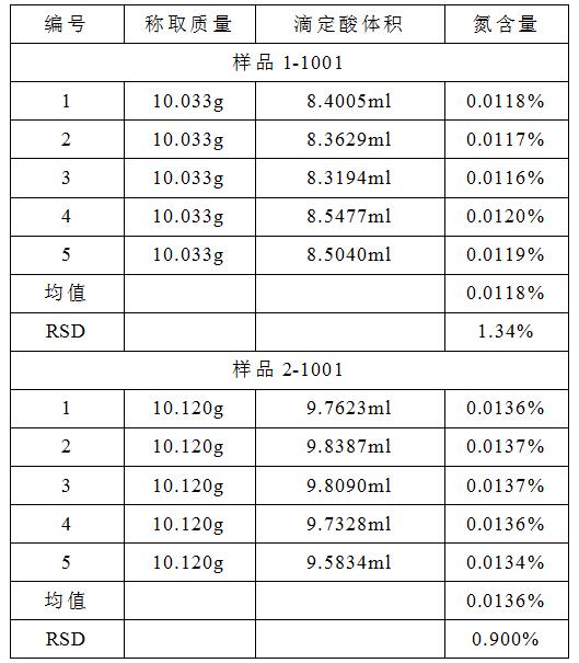 樣品消解:先揮去大部分水分,防止上沖;為避免硫酸過量損失,防止消化管燒干,可用玻璃漏斗代替排廢罩。消解過程中注意觀察,消解澄清后30min停止加熱。從樣品測定結果來看平行性良好,符合藥典要求。