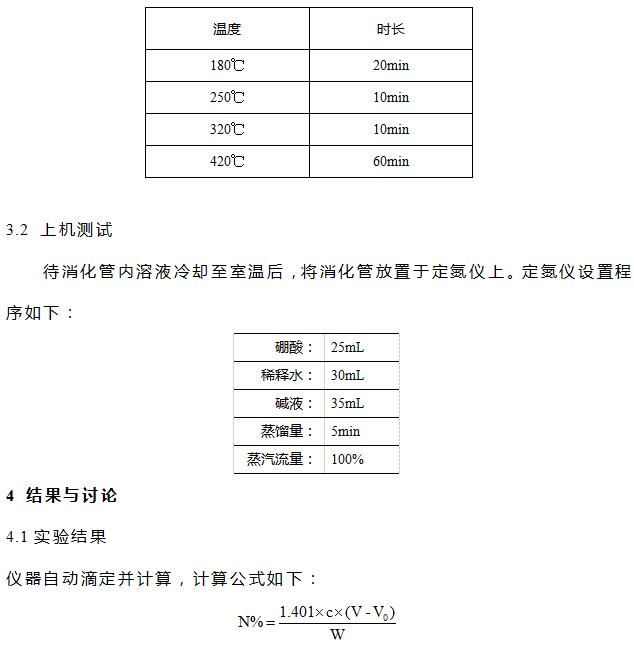 硫酸(分析純),硼酸(分析純),氧化鈉(分析純),溴甲酚綠-甲基紅混合指示劑,催化劑片(3g硫酸鉀和0.2g硫酸銅混合均勻壓片),0.1mol/L鹽酸標準滴定液。