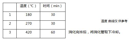 利用石墨消解爐進行消解,將消化管放在石墨上,蓋上排氣罩,連接廢氣吸收系統,設定消解溫度參數如下表:
