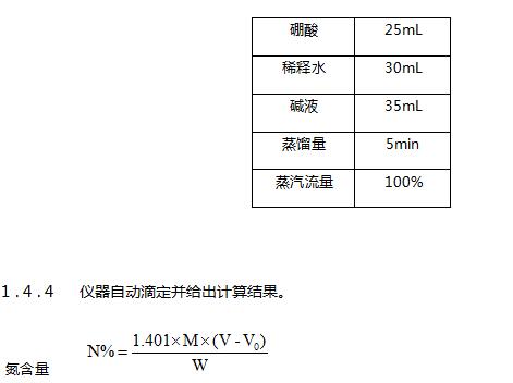 待消化管內溶液冷卻至室溫后,將消化管放置于定氮儀上,開始蒸餾滴定。定氮儀設置程序如下: