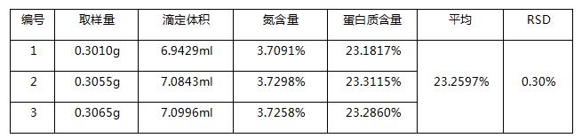 根據《 NY/T 598-2002 食用綠豆》中,粗蛋白含量高于23%為二級綠豆。使用凱氏定氮儀測試綠豆中粗蛋白含量,結果準確,平行性良好。