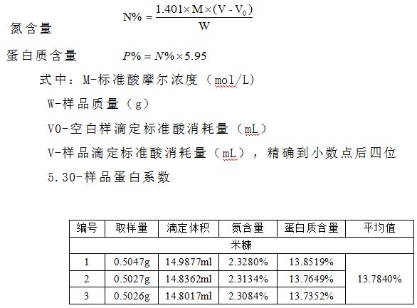 米糠中的有機態氮在濃硫酸和催化劑的共同作用下,轉化為氨態氮。加堿蒸餾,用硼酸吸收后,再以鹽酸或硫酸標準滴定液進行滴定。